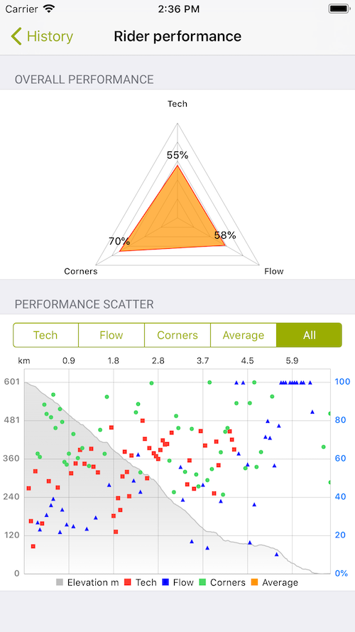 The very best feature of MTB Chart is the Rider Performance Report representing 3 skillset metrics: Technique, Flowing and Cornering.
